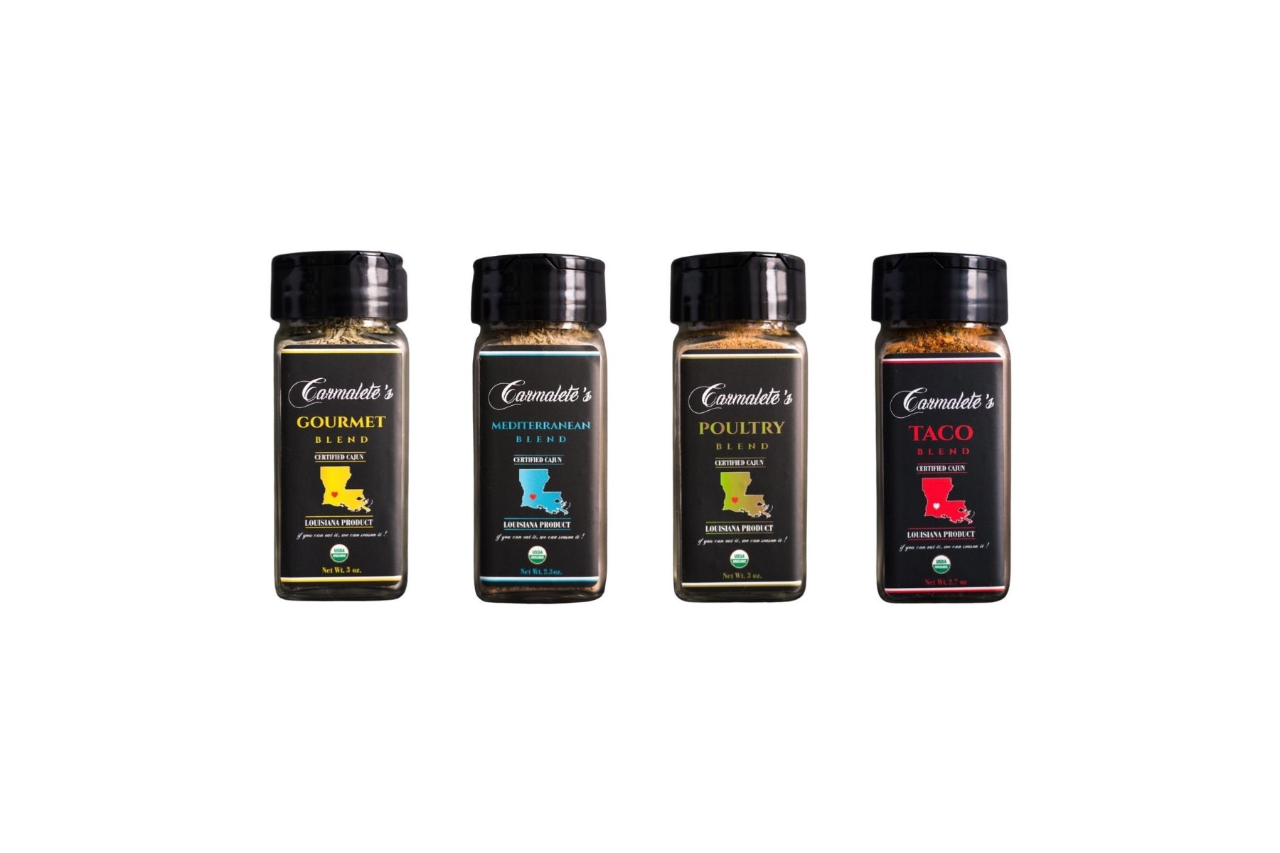After working, almost 2 years, with a Certified Organic blender and distributor, we are finally in business.  Added to Carmalete’s All Natural Seasoning and Fry Mix, are 5 Organic blends in 3 oz glass bottles